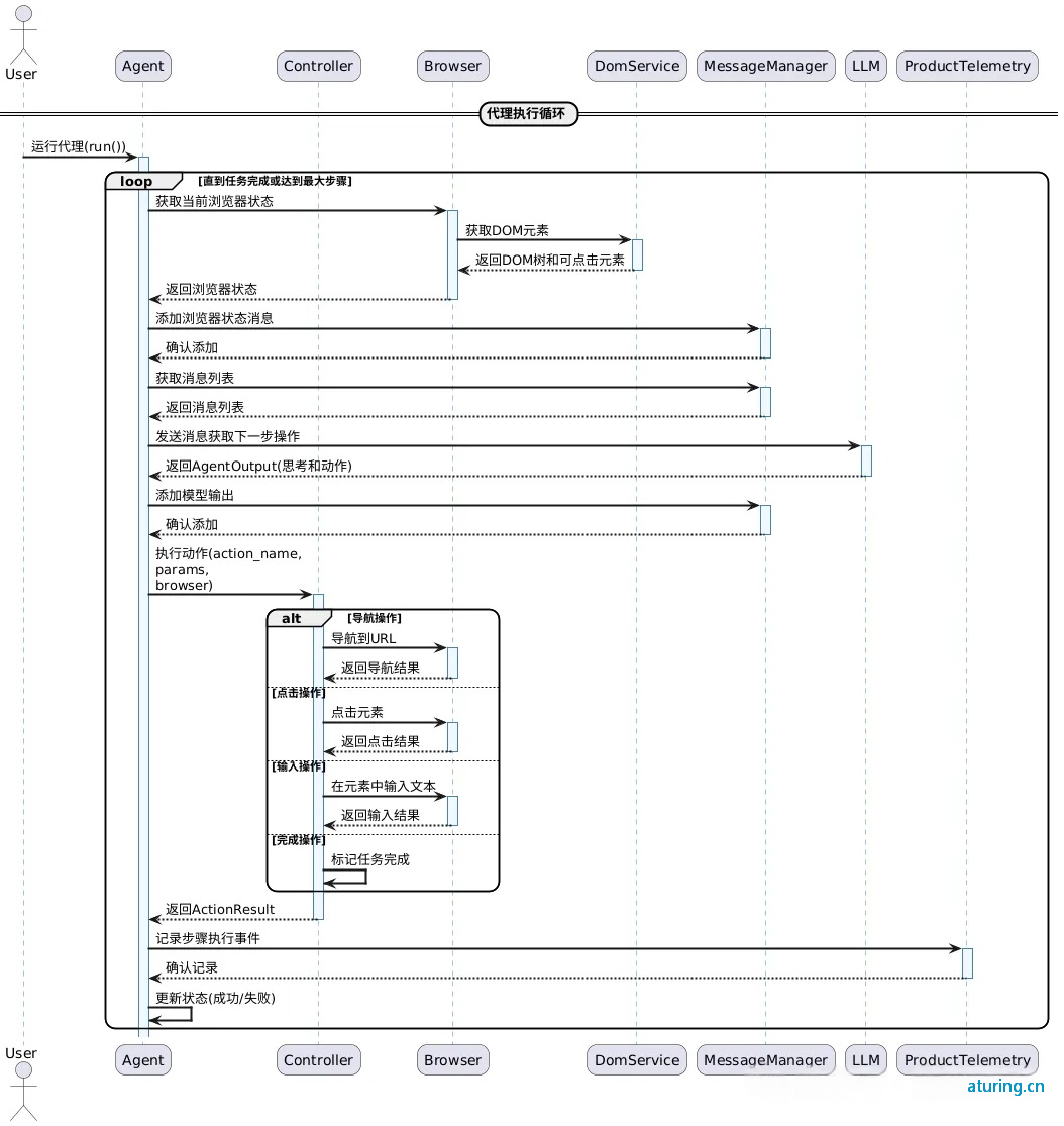 执行循环阶段是整个流程的核心,代理会重复执行以下步骤,直到任务完成或达到最大步骤数: