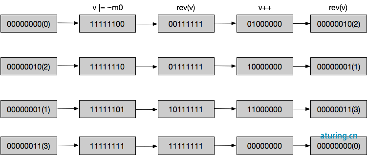 左半边 (v|m0) + 1 将 V 的低位设置为 1,然后 +1 将进位到 v 的高位,再次 &m0,V 的高位将被取出。